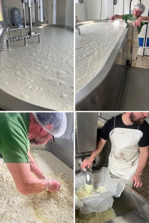Los Campo hacen queso a partir de leche cruda de su propio rebaño de vacas en pastoreo, que se puede divisar desde la quesería. De hecho, su lema es "Pasto, Leche, Queso. En ese orden." Y ciertamente pudimos comprobar cómo lo ponen en práctica a rajatabla en sus instalaciones. Esta quesería deja un sello de calidad que te marca porque sus procesos son artesanales, pero muy minuciosos. Se nota cuando pruebas sus quesos y aprecias en ellos un equilibrio exquisito. Pudimos comprobar en directo cómo llevan a cabo las diversas fases de la creación del queso, desde el cuajado y desuerado hasta el corte, molde y salado… ¡fue una auténtica lección de sabiduría y buen hacer!